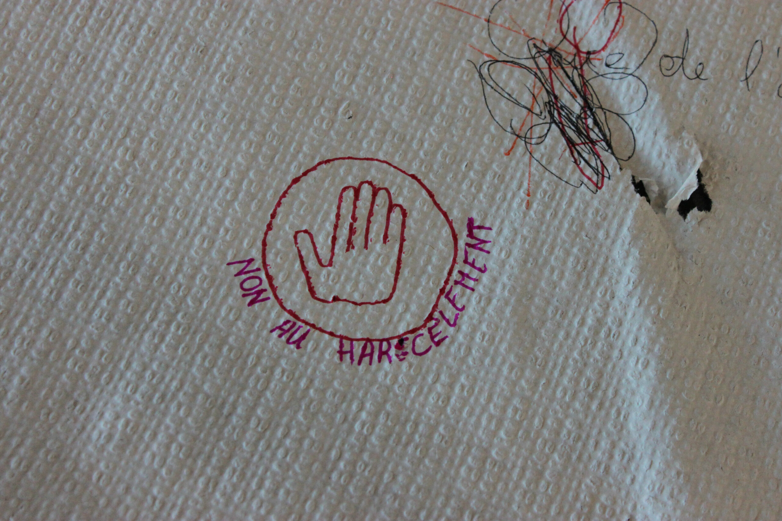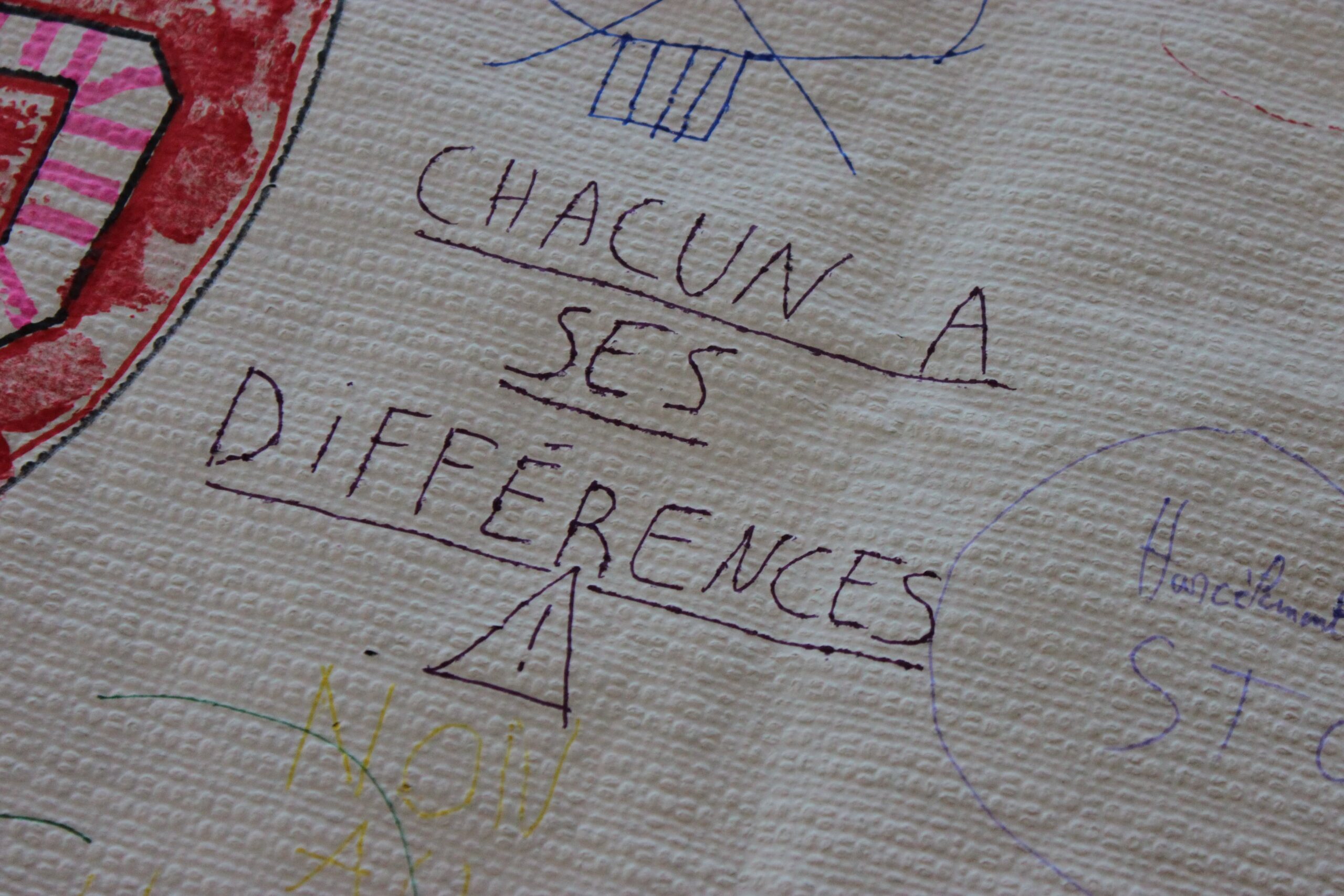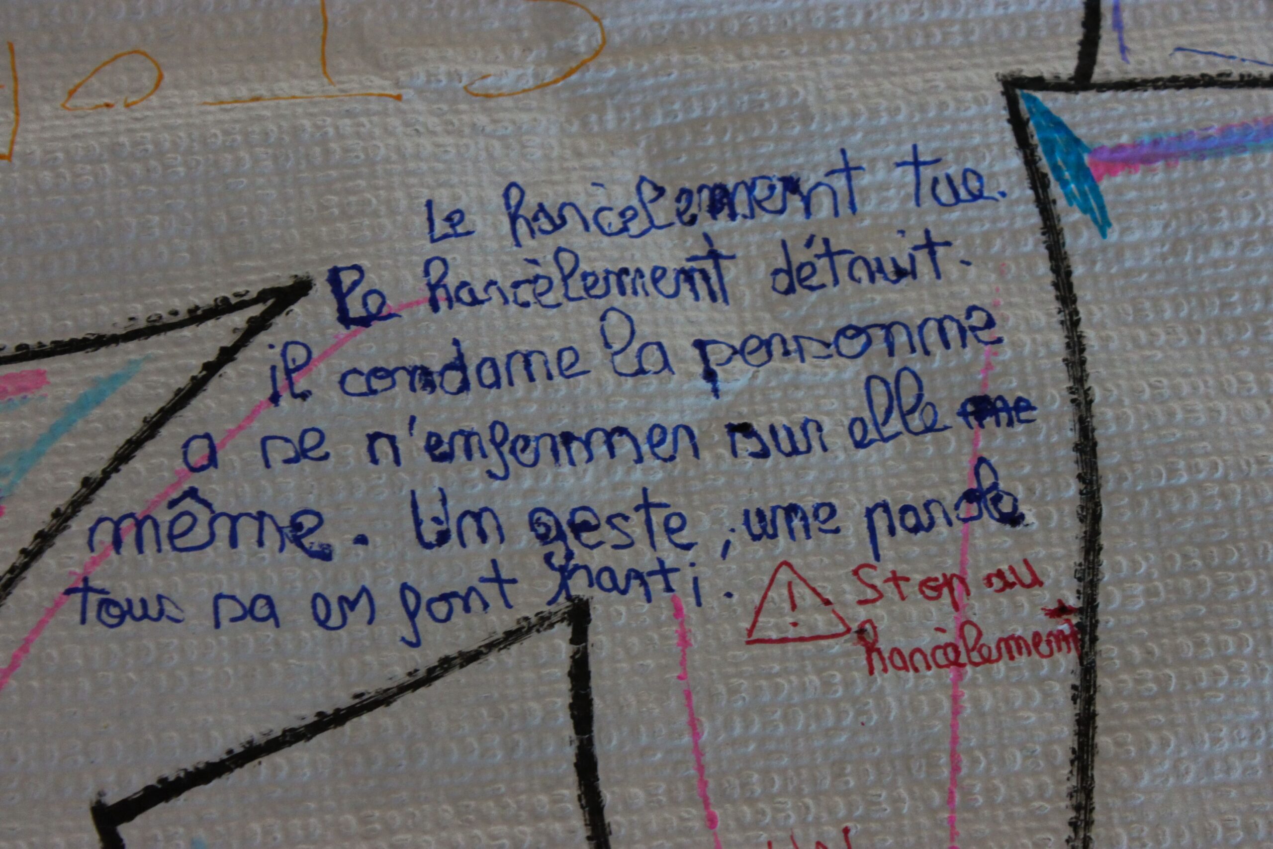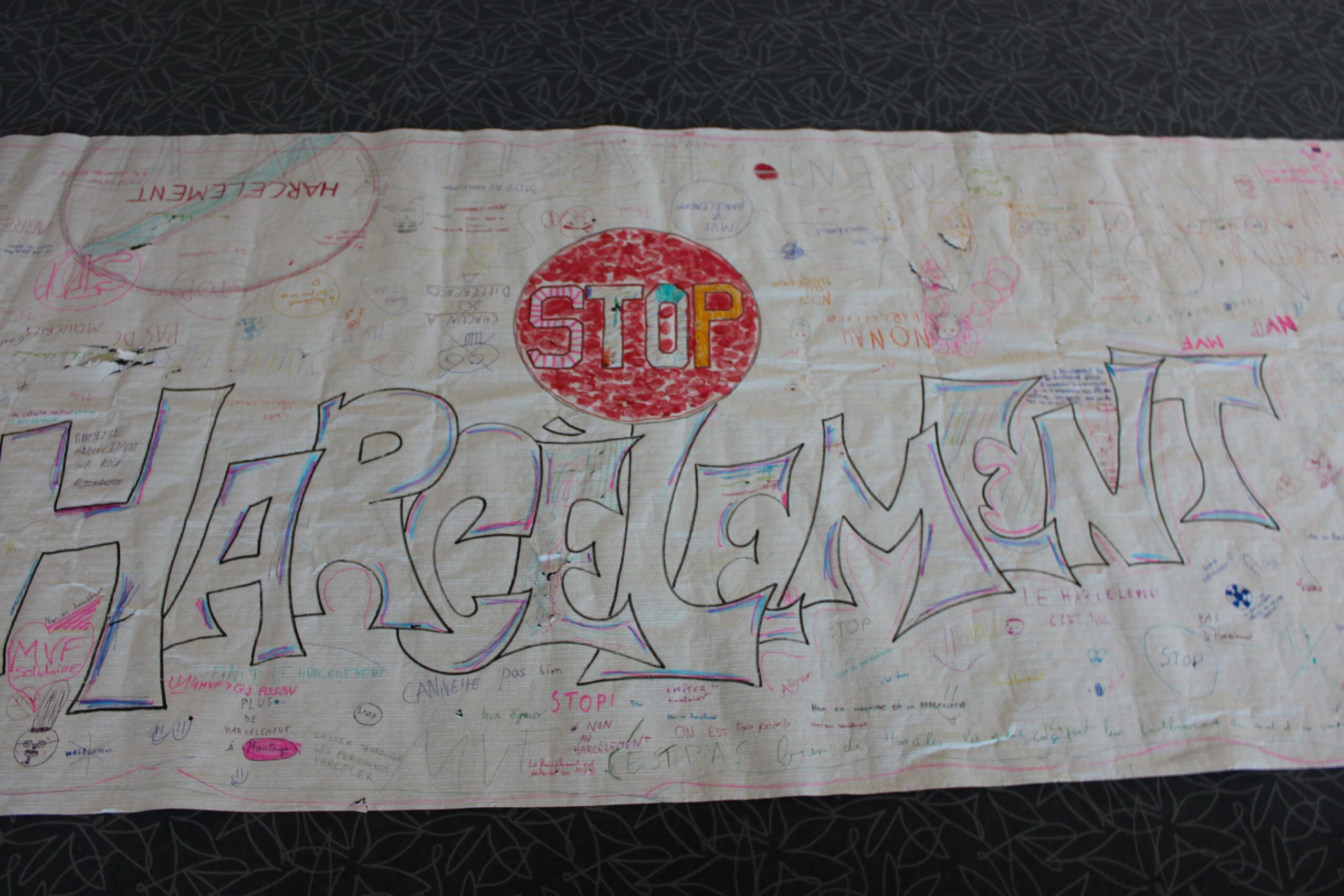Un temps d’expression libre autour d’une fresque vierge portant un panneau STOP et l’inscription « STOP AU HARCÈLEMENT ». Les jeunes ont pu écrire ce que représente pour eux le harcèlement et pourquoi il doit s’arrêter. Une photo de groupe a ensuite été réalisée.